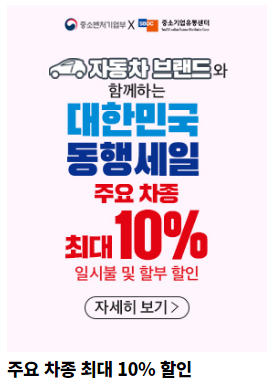 대한민국 동행세일 자동차 할인 행사는 현대자동차, 기아자동차, 쌍용자동차가 참여 합니다. 쌍용자동차는 내알 1일~31일까지 모든 차종을 할부 또는 일시불 구매 시 할인 혜택을 제공합니다. 현대 자동차는 같은 기간 주요 차종을 최대 10% 할인, 기아자동차는 최대 3% 할인합니다.