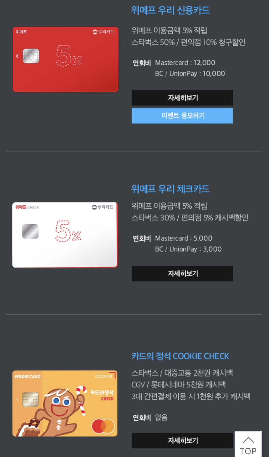 저같은 경우는 맨위의 위메프 우리 신용카드를 만들었습니다.