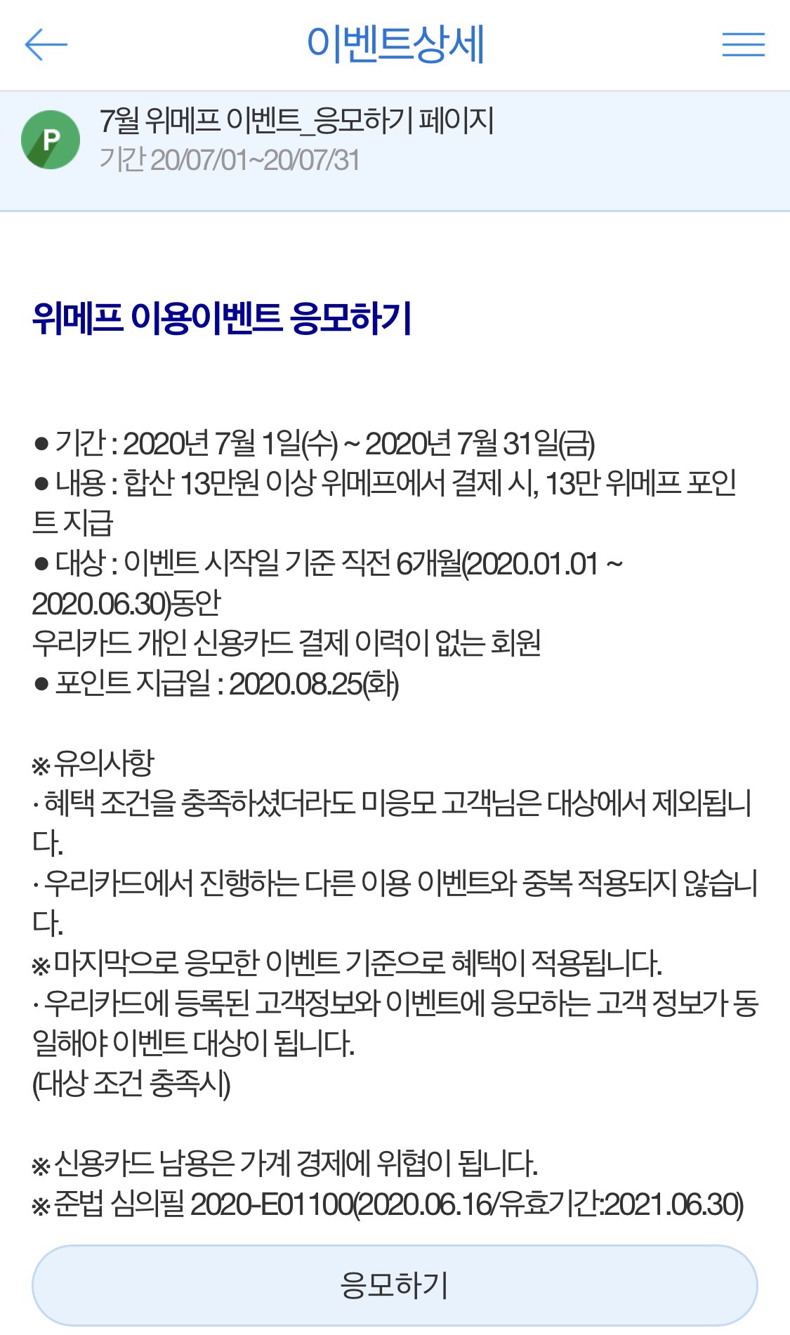 중요포인트는 이벤트 시작일 기준 직원 6개월(2020.01.01~2020.06.30)동안 우리카드 개인 신용카드 결쩨 이력이 없는 회원 입니다.