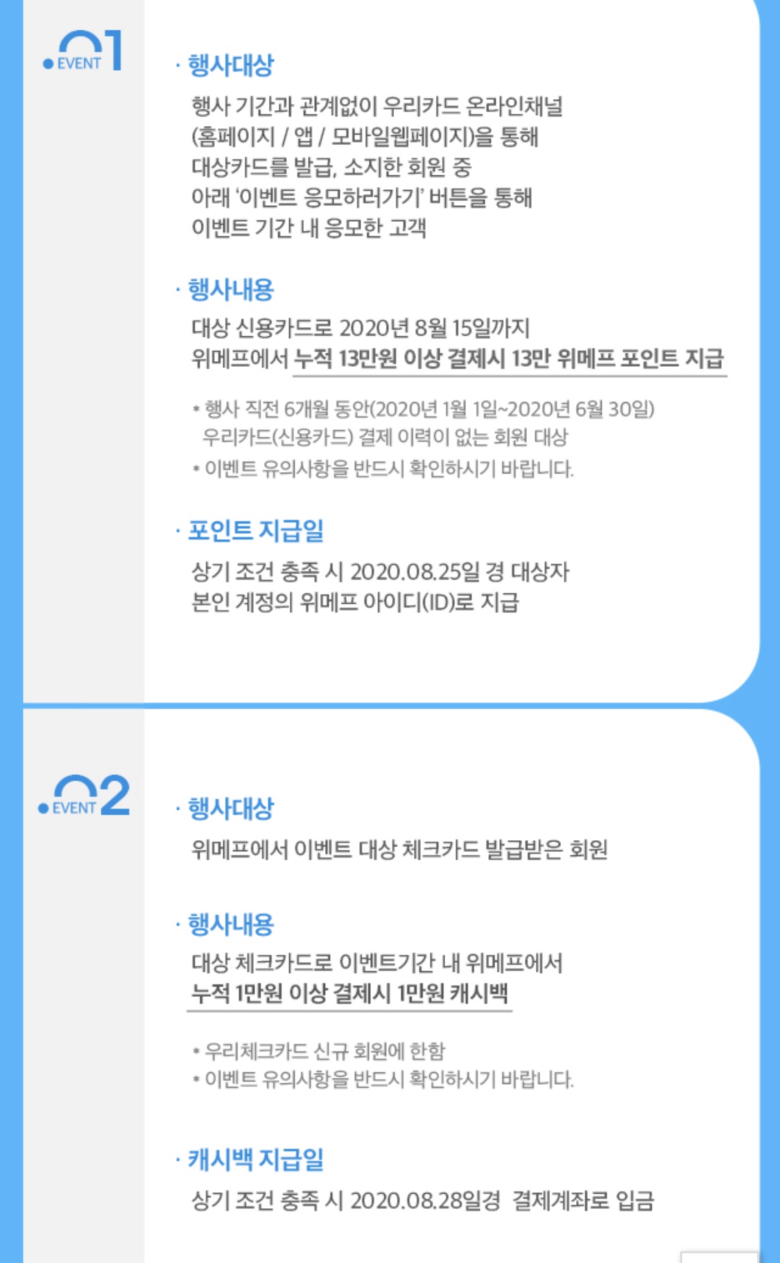 행사대상은 우리카드 온라인채널을 통해 대상카드를 발급, 소지한 회원 중 아래 ‘이벤트 응모하러가기’ 버튼을 통해 이벤트 기간 내 응모한 고객 입니다.