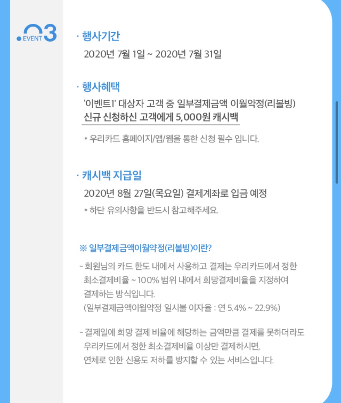 이벤트 대상자중 리볼빙 신규 고객은 5,000원 추가 캐시백 지원합니다.