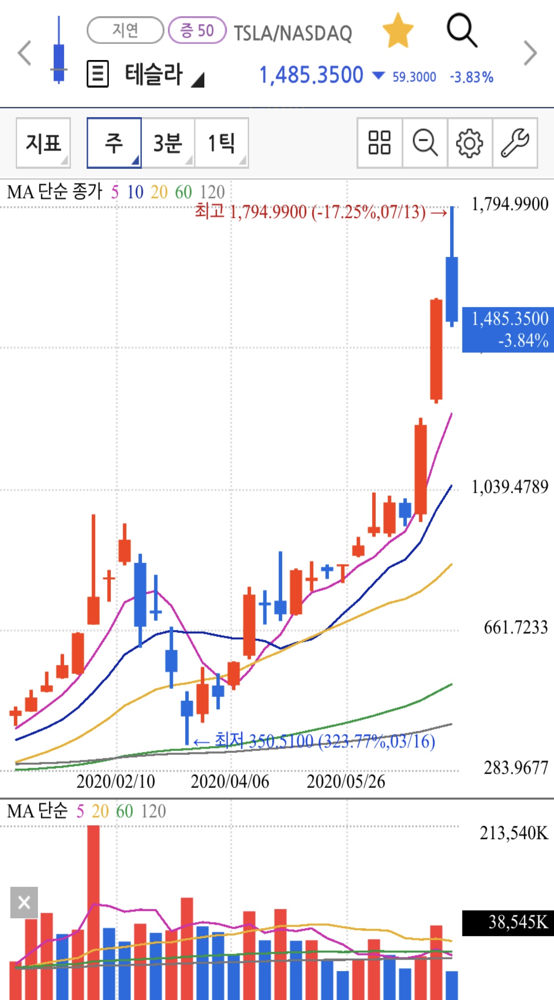 테슬라는 300불 후반까지 내려갔었는데 1500불까지 올라갔죠?
