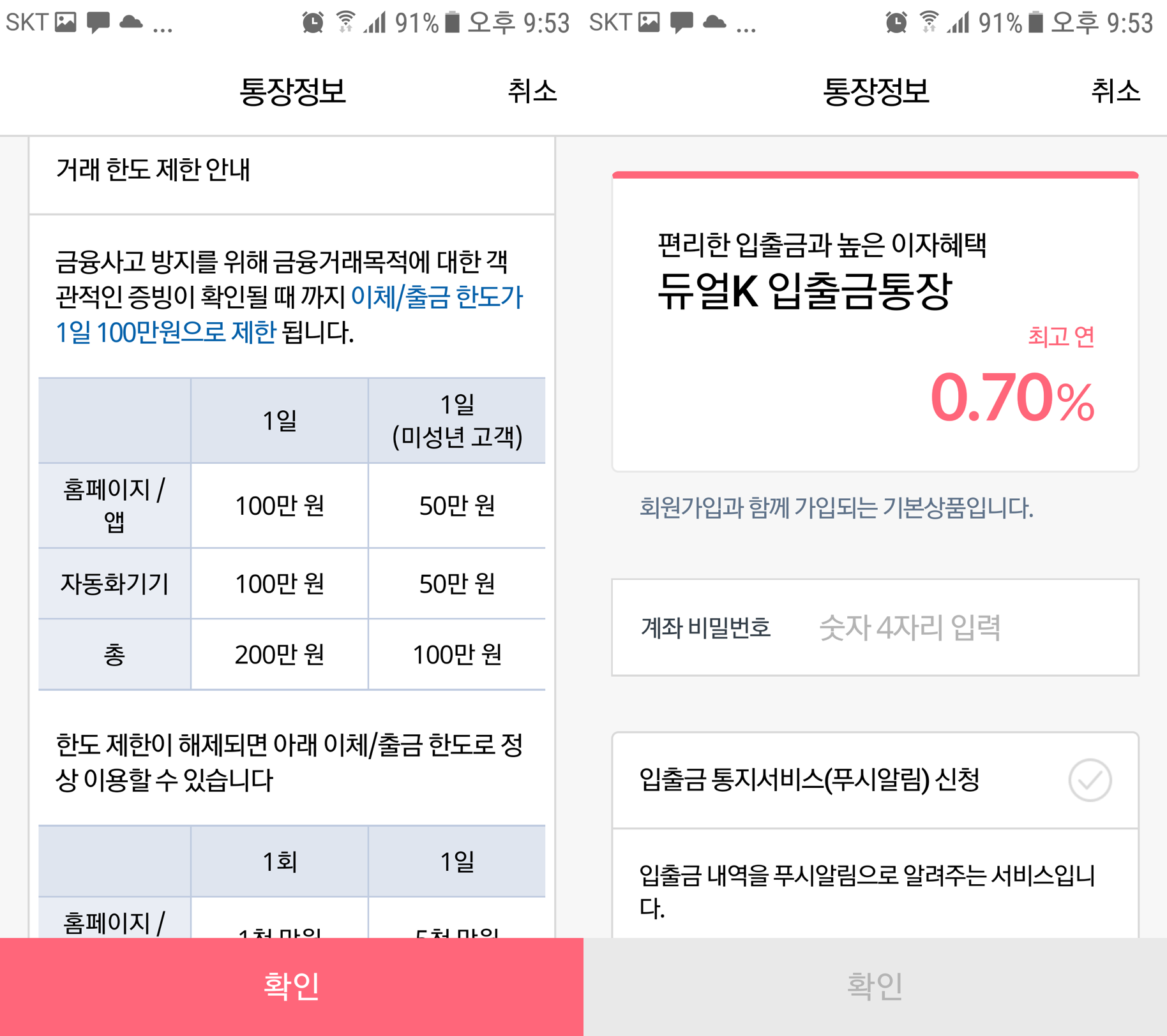 거래한도제한 안내를 확인 하고 확인버튼을 누릅니다.