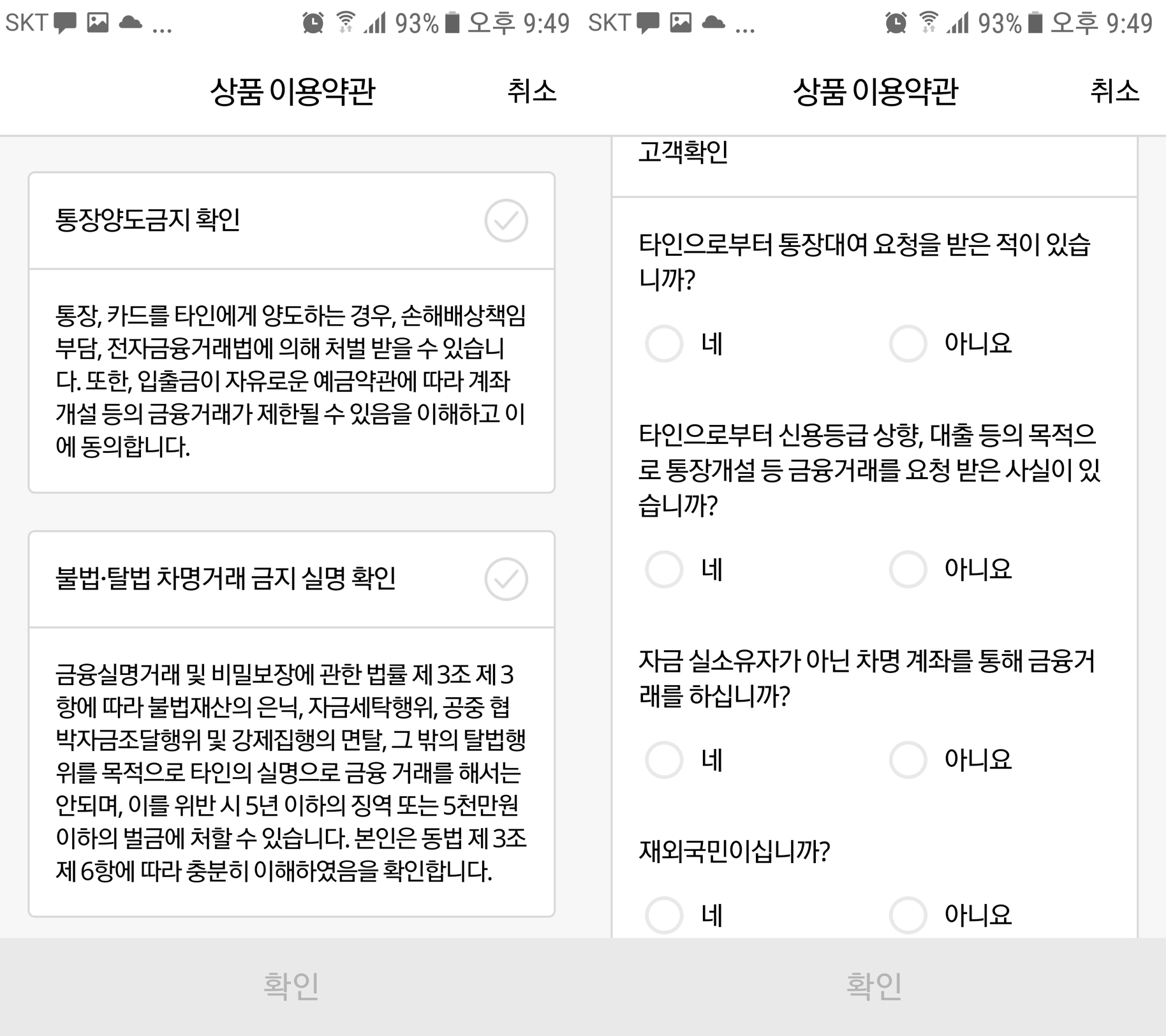 통장양도금지 확인 체크, 불법.탈법 차명거래 금지 실명확인 체크 후 스크롤을 아래로 내립니다.